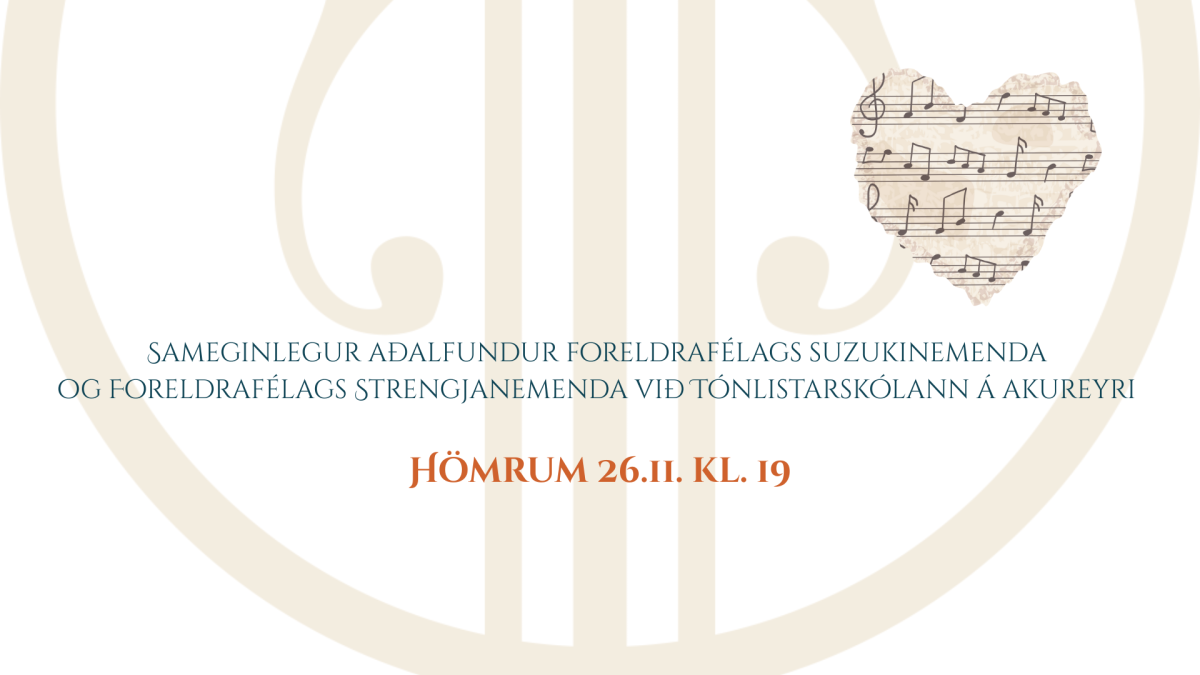 Miðvikudaginn 26. nóvember 2025 verður haldinn sameiginlegur aðalfundur Foreldrafélags Suzukinemenda og Foreldrafélags Strengjanemenda við Tónlistarskólann á Akureyri. Fundurinn verður haldinn kl. 19:00 í Hömrum á 1. hæð í Hofi.