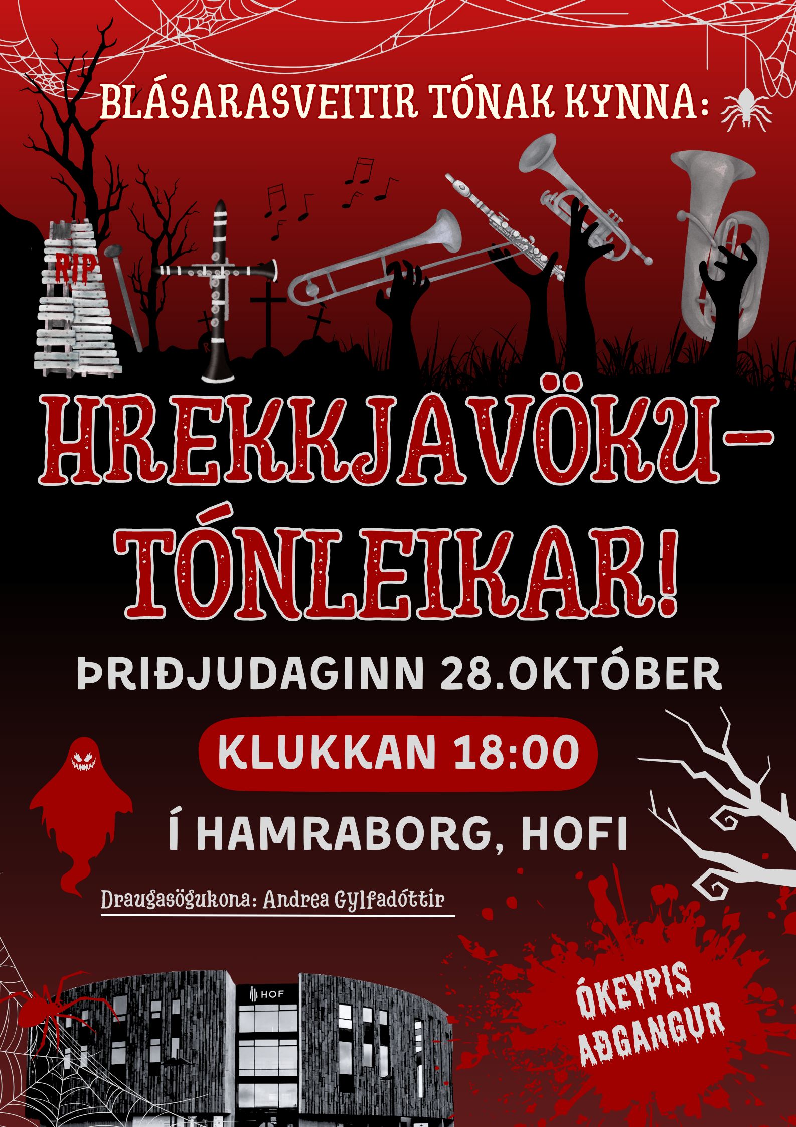Í kvöld kl. 18:00 verða árlegir Hrekkjavökutónleikar blásarasveitanna í Hamraborg, Hofi og má reikna með að mikið verði um dýrðir. Aðgangur er ókeypis og öll velkomin. Draugasögukona er engin önnur en Andrea Gylfadóttir. Allar sveitir A, B og C munu spila hryllilega og hrollvekjandi tónlist fyrir ykkur og mikið hefur verið lagt í skreytingar eins og venjulega. Húsfyllir hefur verið á þessa tónleika undanfarin ár og því hvetjum við alla til að mæta tímanlega til að tryggja sér sæti.