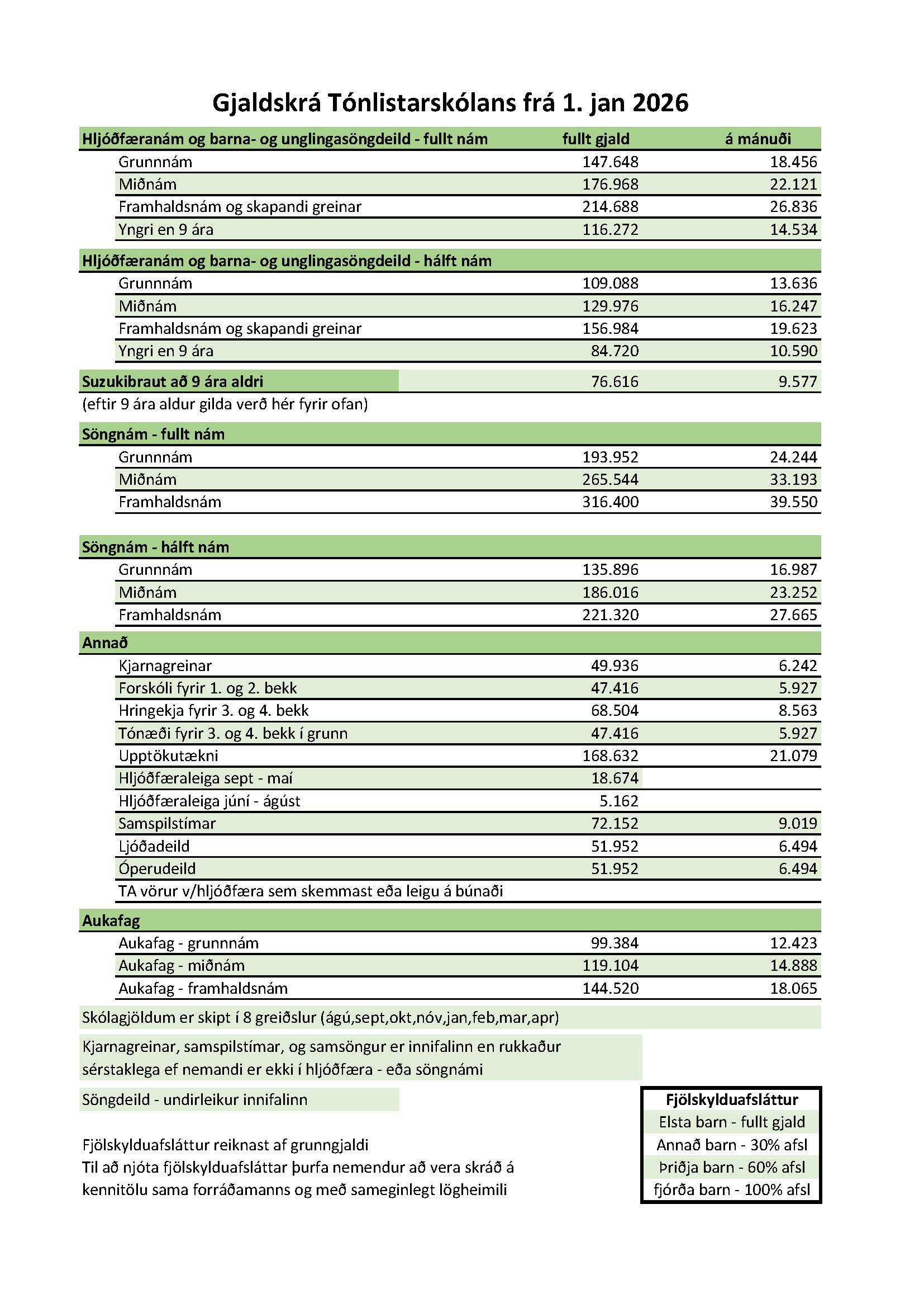 *Ef nemandi er á framhaldsstigi í hljóðfæraleik eða mið- eða framhaldsstigi í söng, þá sér ríkið um að borga kennslukostnaðinn.